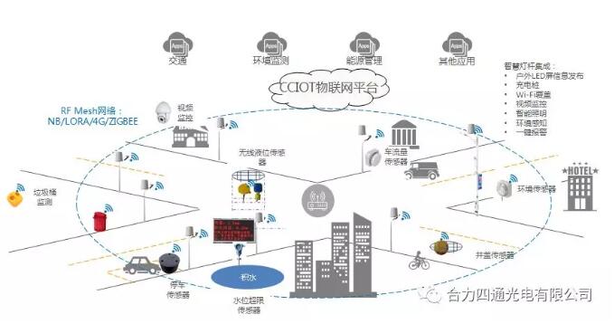 智慧城市建设需要依靠大量的感知设备采集信息资源,由于路灯有着遵循着城市道路、街道分布的特点,具有密切分布,数量巨大等优势,并且路灯具备“有电可供、有安装位置、方便接入网络”三位一体的特点,同时结合城市道路需求可设立不同类型的普通杄或综合杄,通过利用无处不在的路灯及加载自身需要的控制系统,实现物联网的组网与传输,结合各城市管理业务应用系统,从而实现以智能照明系统为载体的城市智慧化管理。