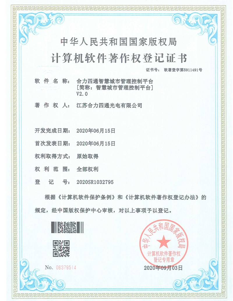 热烈祝贺我司获得“合力四通智慧城市管理控制平台计算机软件著作权登记证书”